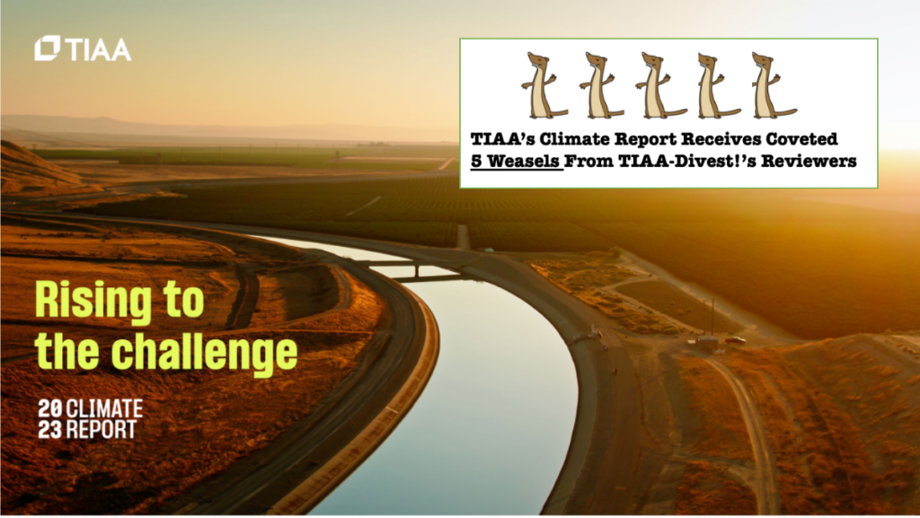 TIAA’s 2024 climate report is titled “Staying the course”, a very accurate description of what’s inside. The 2024 report is a near-copy of the previous year’s document, and answers none of the questions we asked. At this point, it’s obvious that the TIAA “Responsible Investing” department is just going through the motions and they hope that nobody will bother to read their work. You can read the full report on OUR website, but don’t expect to learn much.